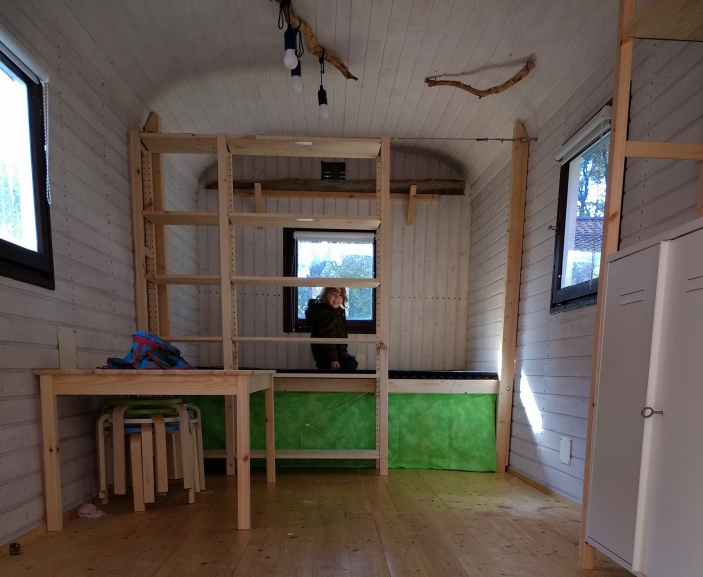 Der kleine Bauwagen ist hell und freundlich eingerichtet. Er bietet Platz nicht nur Reserve-Kleidung, sondern auch zum basteln, spielen und notfalls auch zum Frühstücken. In der kalten Jahreszeit wird er mit einem Holzofen beheizt, der auch zum Wasser erwärmen und Trocknen zwischendurch genutzt wird. Eine Kuschelecke lädt mit Decken und Kissen zum Ausruhen und Bücher schmökern ein.Seit Oktober haben die Eltern der Wurzelkinder den Wagen durch eine überdachte Veranda erweitert, die zusätzlichen Platz bietet.